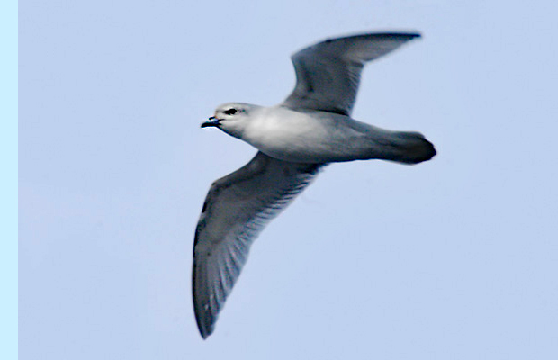 Abundant but more restricted to three discrete breeding areas with less dispersal, more than one species could be involved. Southern Indian Ocean, South Georgia and Falklands, and south-east Australia and New Zealand are the three areas involved. Both this and the next species are fairly easily distinguished from other prions by broad black tail bands among other features, but away from breeding areas separating the two is problematic. The photos were taken off South Georgia, where Fulmar Prion doesn't occur.